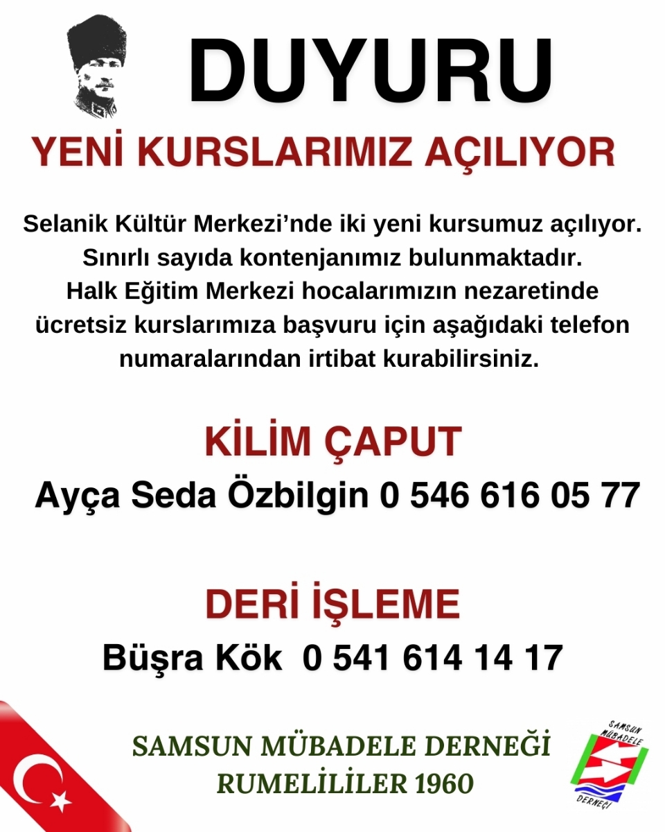 Halk Eğitim Merkezi hocaları nezaretinde ücretsiz açılacak iki yeni kurla ilgili bilgiler görselde yer alıyor.